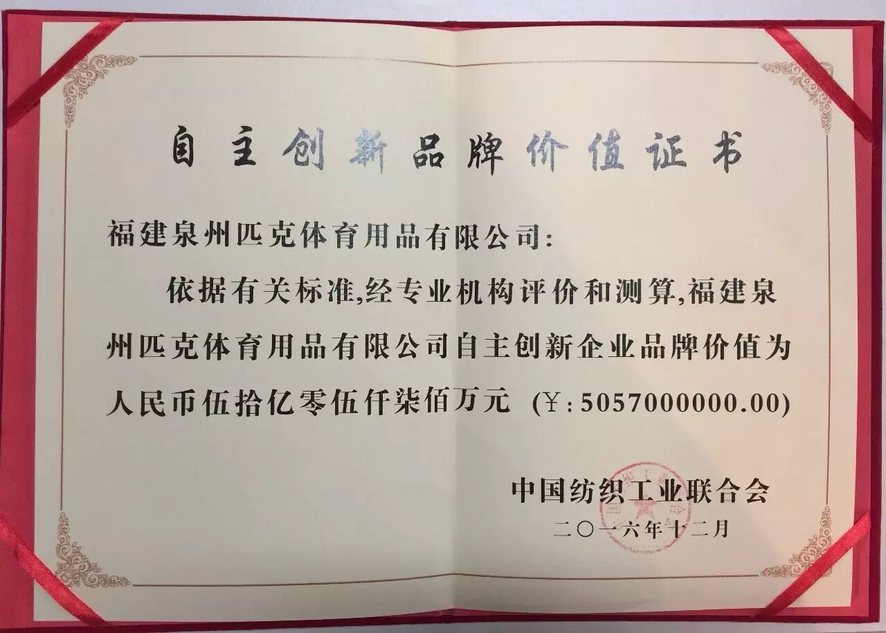 近日,中国品牌价值500强评审委员会揭晓了第十届中国品牌价值500强榜单。共有18个泉州品牌跻身500强榜单,匹克以99.93亿元的品牌价值位列第350名。500个上榜中国品牌的总价值高达130536亿元,平均每个上榜品牌的价值为261亿元。2015年,平均每个上榜品牌的价值为233亿元。2014年,平均每个上榜品牌的价值为222亿元。这表明在过去一年里,企业品牌价值的增长幅度超过12%,比上一届5%的增幅有较明显的提升。